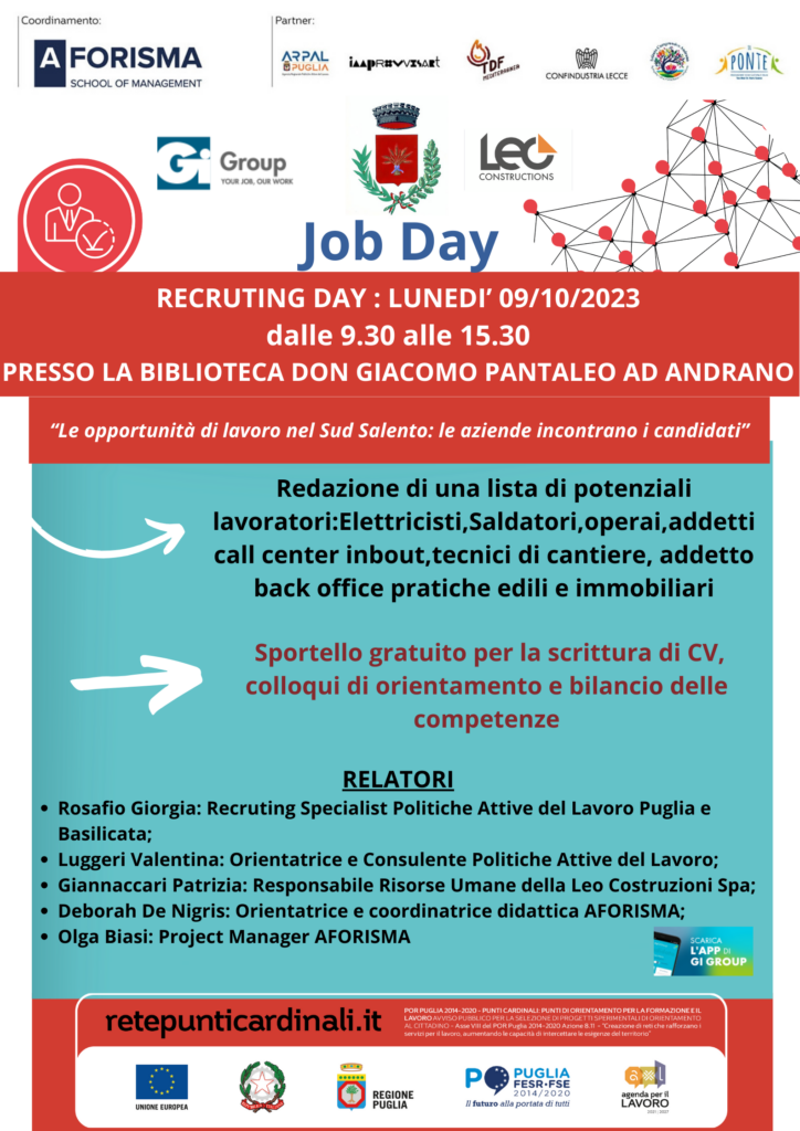 Gi Group Spa e Leo Costruzioni Spa ti accompagnano a scoprire il mercato del lavoro nel Sud Salento, fornendoti gli strumenti necessari per costruire il percorso lavorativo che più desideri. Gli esperti ti aiuteranno a presentare la tua candidatura.