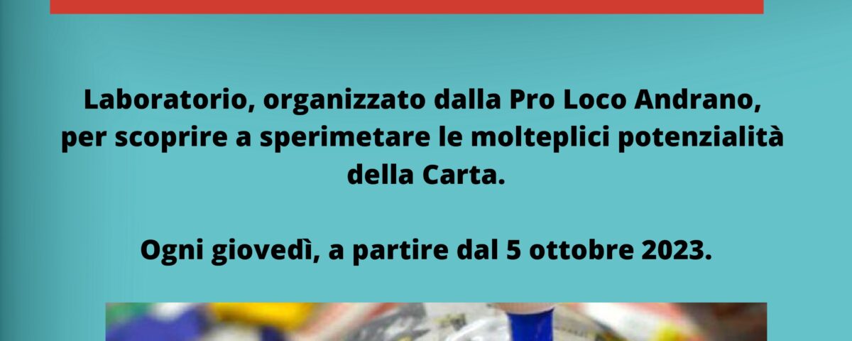 Chissà cosa ci regaleranno i nostri piccoli cartapestaii delle classi 3° e 4° dell’Istituto Comprensivo di Andrano, che grazie a questo laboratorio organizzato dalla Pro Loco nell’ambito del progetto del Comune di Andrano “Lavoro e (è)crescita” di Punti Cardinali, potranno scoprire i segreti di un lavoro artigianale che si avvicina alla pura espressione d’arte, con l’aiuto delle sapienti mani dell’esperta Arianna Saracino