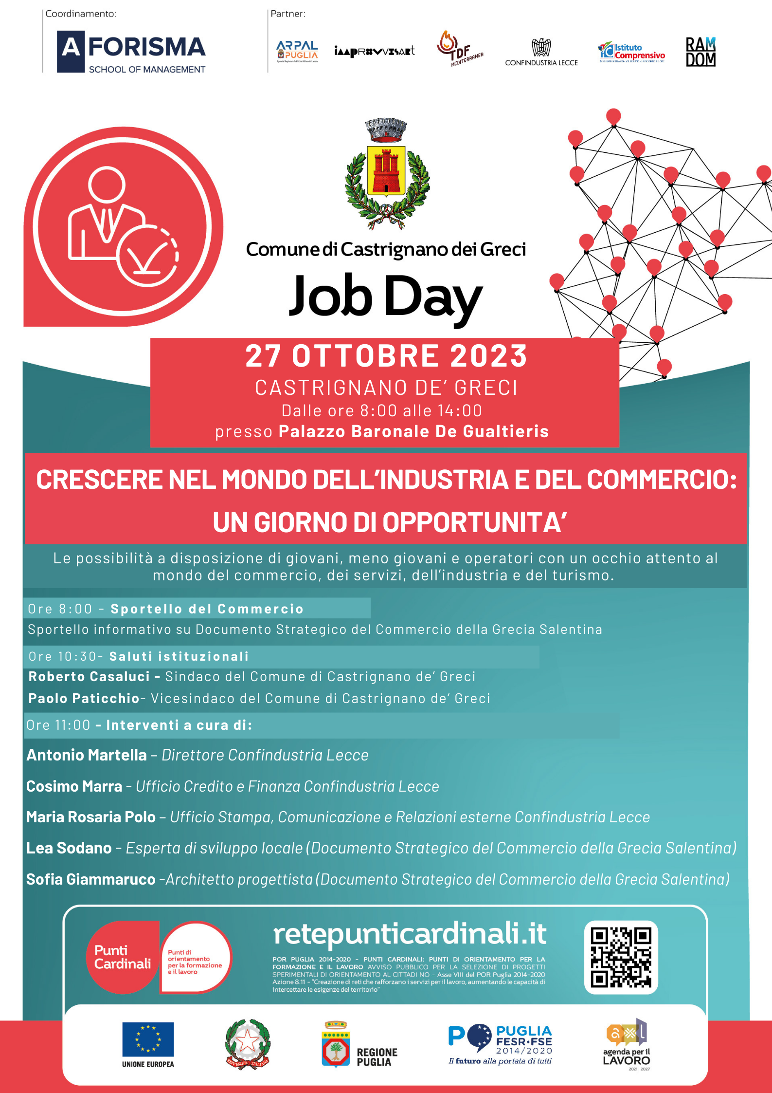 Comprendere come si muove l’economia del territorio anche per accompagnare gli studenti verso scelte più consapevoli del proprio futuro scolastico e professionale. Il territorio salentino è ricco, infatti, di opportunità in diversi settori produttivi e del commercio che non sono note a tutti. L’incontro vuole contribuire a declinare ogni possibilità a disposizione di giovani e meno giovani, operatori con un occhio attento al mondo del commercio e dei servizi, nonché a quello dell’industria e del turismo. Valorizzare concetti quali cultura d’impresa, lavoro, sacrificio, talento, aspirazioni, competenze è l’obiettivo del job day che vuole stimolare la necessità di porsi obiettivi importanti da raggiungere mediante opportuni strumenti e soft e hard skill. La conoscenza inoltre del Documento del Commercio e dei bandi di finanziamento per l’avvio di start up, imprese, micro imprese sarà un ulteriore corollario dell’incontro.