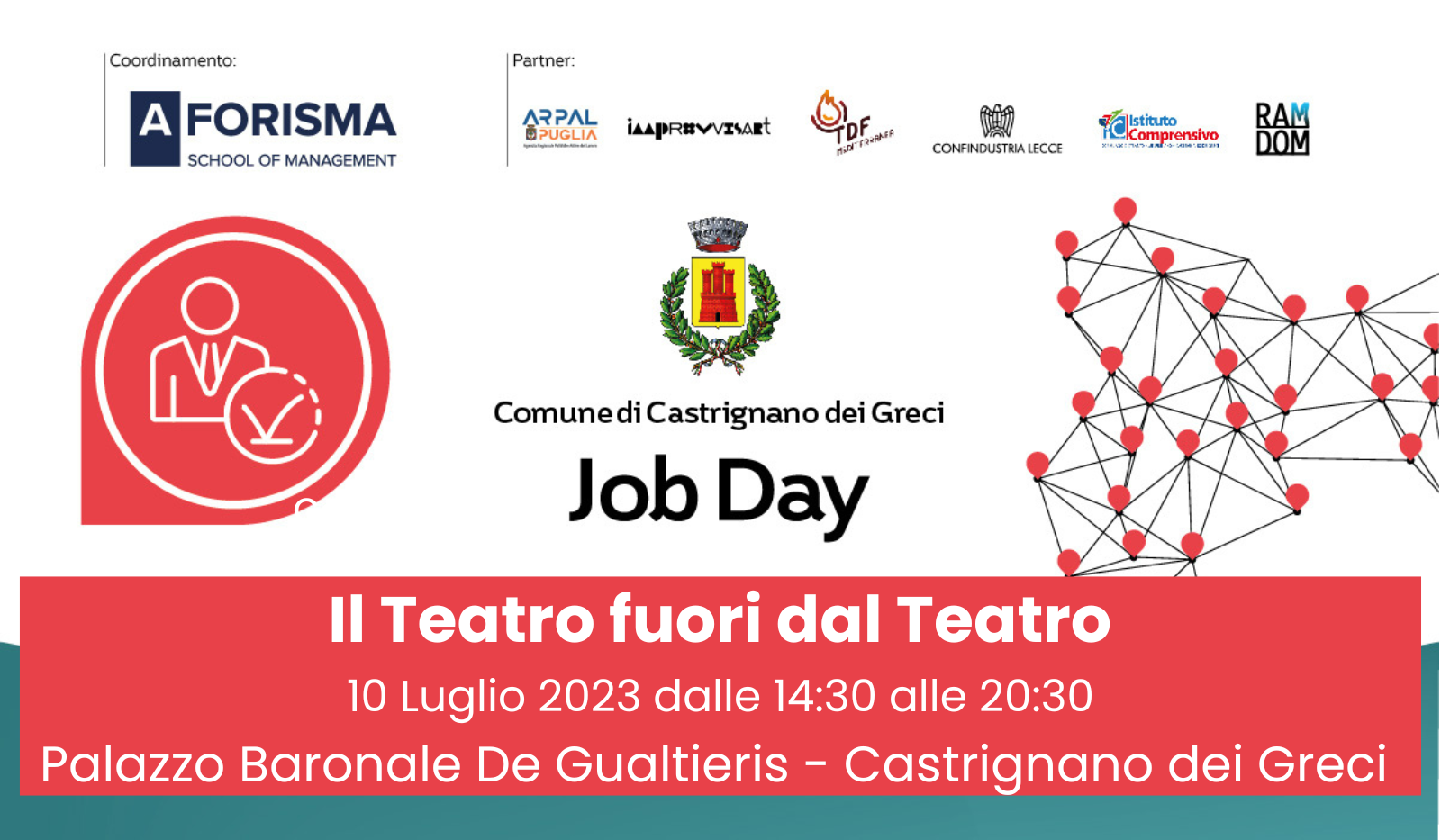 L'incontro offrirà una panoramica su quella che è la situazione attuale del settore teatro e delle azioni necessarie per sfruttare al meglio i talenti che vanta la Puglia. La crisi odierna del sistema teatrale impone agli operatori del settore la necessità di allargare l'offerta dei servizi culturali da correlare al valore sociale, educativo ed economico del teatro. Il Job Day intende fornire nuovi strumenti per fare impresa nel territorio pugliese con il teatro e per il teatro, attraverso la testimonianza di professionisti di successo e la presentazione di buone pratiche.