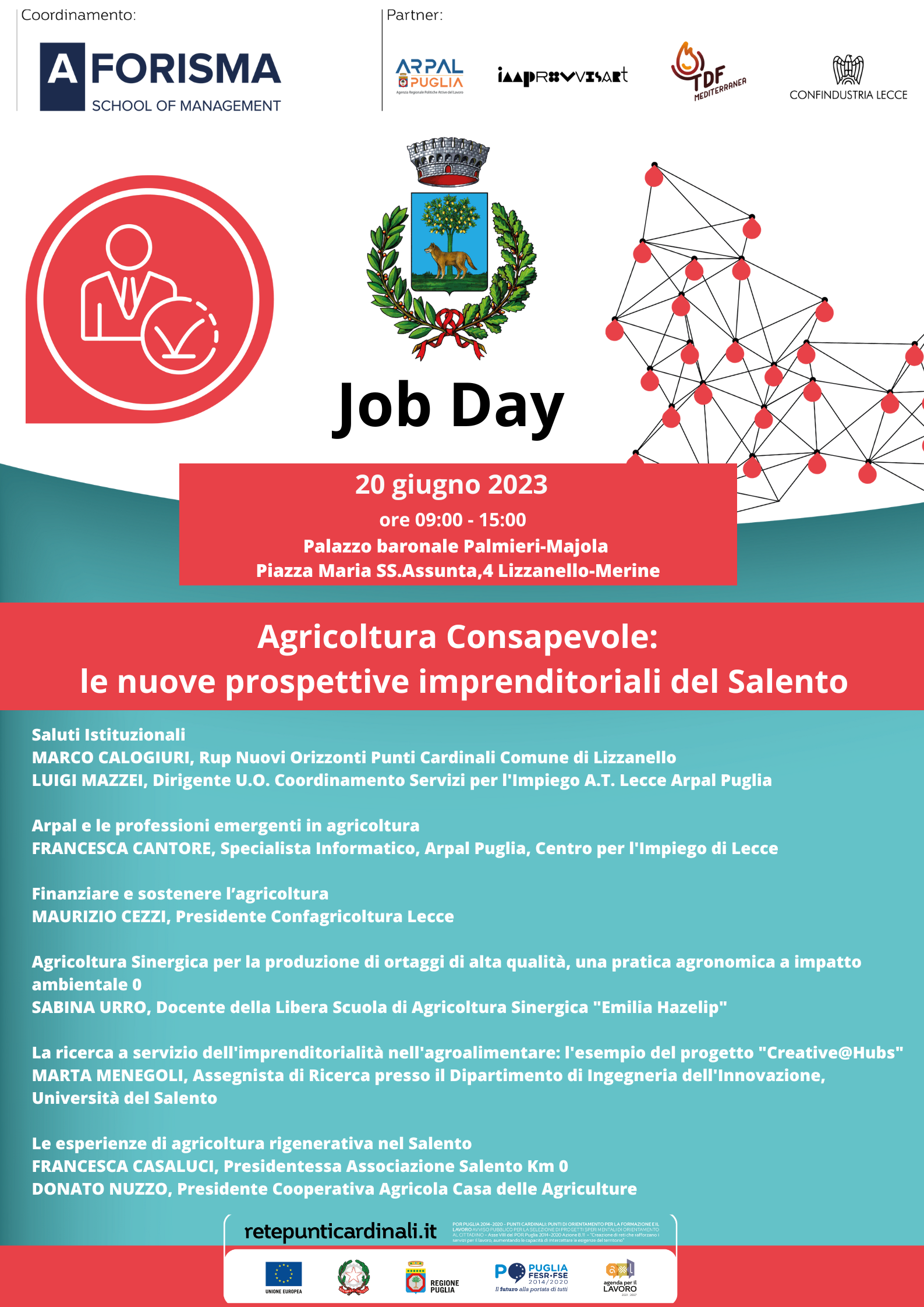Il job day partirà dall’idea della creazione di impresa, con particolare attenzione alle imprese agricole e alle opportunità di finanziamento ad esse riservate. Riteniamo, infatti, che il territorio salentino abbia un potenziale inesplorato rispetto alla riqualificazione della terra. Molti sono infatti i terreni abbandonati e molte le realtà che resteranno tali, visti i disastri ecologici che attualmente stanno devastando il nostro ecosistema.