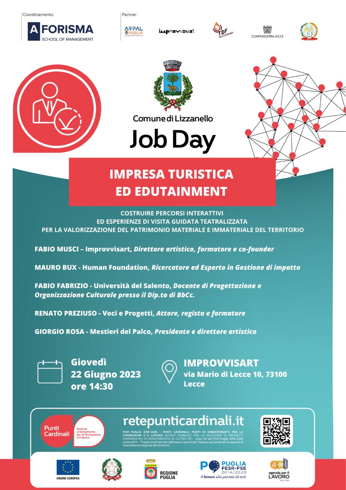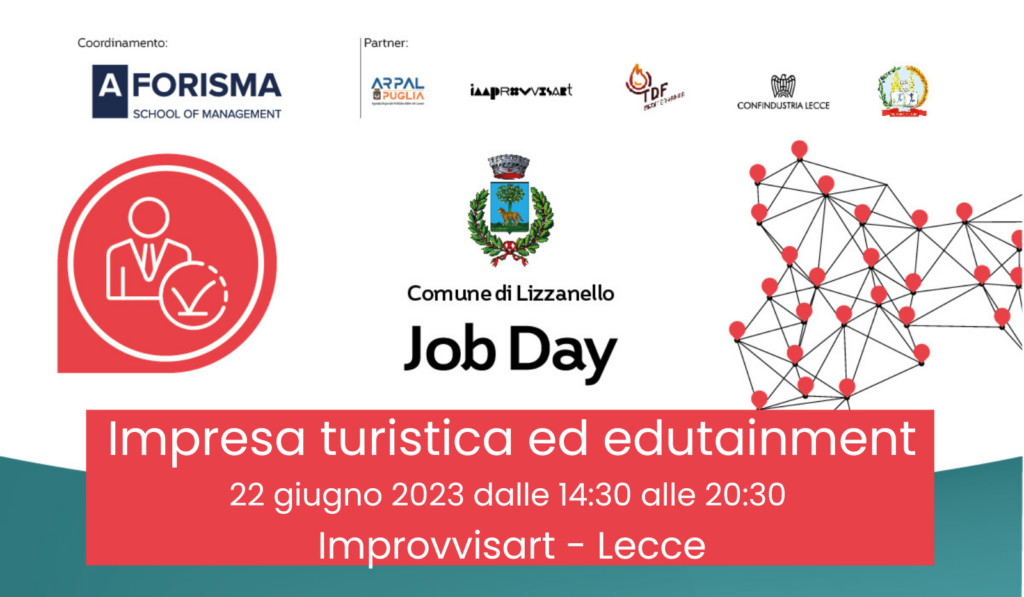 L’incontro è organizzato in collaborazione con Aforisma Business School e il Comune di Lizzanello. I Job Days sono finanziati dall’Avviso pubblico “Punti Cardinali: Punti di orientamento per la formazione e il lavoro” della Regione Puglia, una delle misure sperimentali della strategia regionale “Agenda per il lavoro Puglia – il futuro è un capolavoro”, strutturata a seguito del percorso partecipativo “Agenda per il lavoro 2021-2027” Promosso dal Dipartimento Politiche del Lavoro, Istruzione e Formazione.