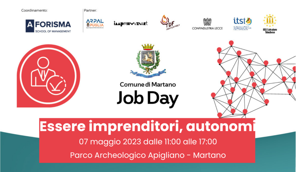Evento organizzato dal Comune di Martano, nell’ambito del progetto “LavoroRete” vincitore dell’avviso pubblico “Punti cardinali: Punti di orientamento per la formazione e il lavoro”, con il partenariato di Aforisma, ImprovvisArt, Confindustria Lecce, TDF-Mediterranea, Its Turismo, IIss Salvatore Trinchese.