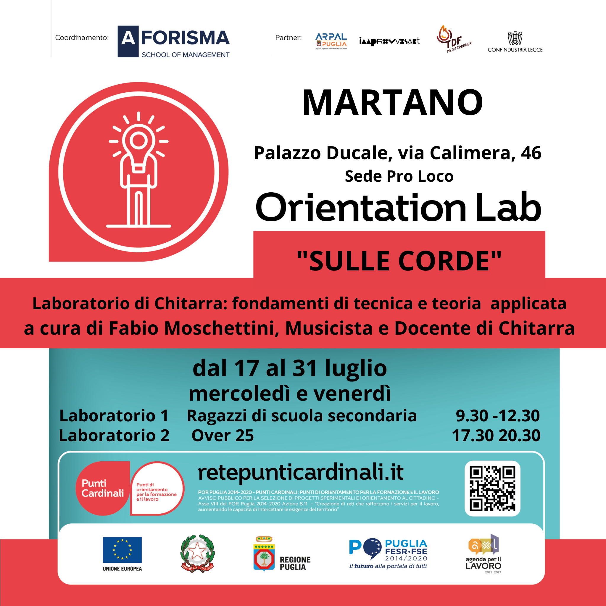 Le lezioni, a cura del docente e musicista Fabio Moschettini, si terranno presso il Palazzo ducale in via Calimera 46 dal 17 al 21 luglio cosi suddivise: