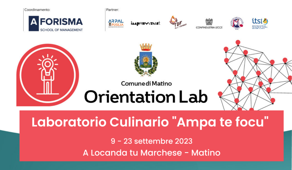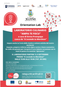 Il laboratorio culinario ”Ampa te focu” sarà tenuto da Greta Protopapa, cuoca pe “ A Locanda Tu marchese” trattoria tipica a Matino che da 22 anni promuove e conserva le antiche ricette e cotture del territorio. L'obiettivo è quello di far vedere come la valorizzazione dei prodotti tipici locali e delle cotture tradizionali possa essere un valore aggiunto per la continua crescita dell'offerta enogastronomica e turistica del nostro territorio dimostrando come tradizione e innovazione possano trovare il loro spazio, raccontando, insieme, il vero Salento, con le mani in pasta e le maniche “nfortacate"