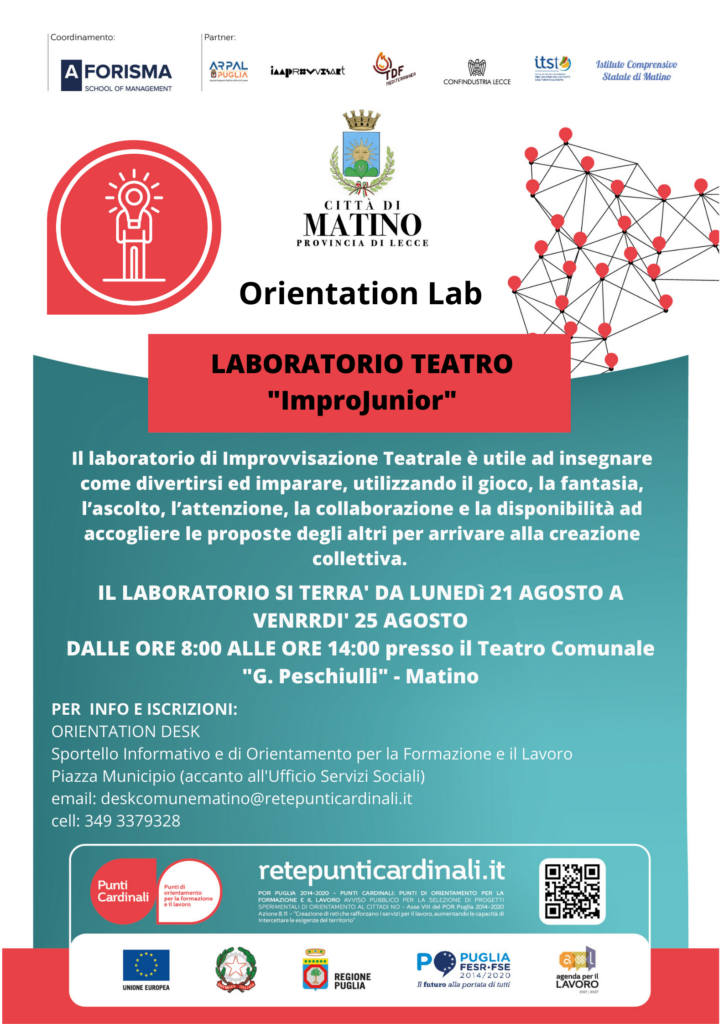 Il laboratorio di Improvvisazione Teatrale è utile ad insegnare come divertirsi ed imparare, utilizzando il gioco, la fantasia, l’ascolto, l’attenzione, la collaborazione e la disponibilità ad accogliere le proposte degli altri per arrivare alla creazione collettiva. L’improvvisazione fa emergere la creatività personale e permette la libera espressione del singolo tramite l’utilizzo di giochi teatrali, l’aggregazione e il divertimento dei bambini