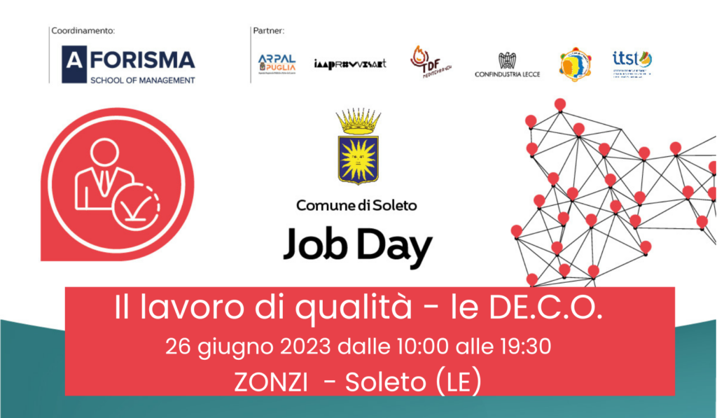 Durante il JOB DAY organizzato nel Comune di Soleto, con la collaborazione di AFORISMA , saranno presentati i prodotti oggetto delle DE.C.O.: “IL PANZEROTTO DI SOLETO”, ” LA TIPICA LENTICCHIA DI SOLETO” E LA PIETRA DI SOLETO con uno sguardo rivolto all’edilizia di qualità quale frontiera delle nuove metodologie che renderanno l’edilizia un settore sempre più innovativo e competitivo del territorio di riferimento.